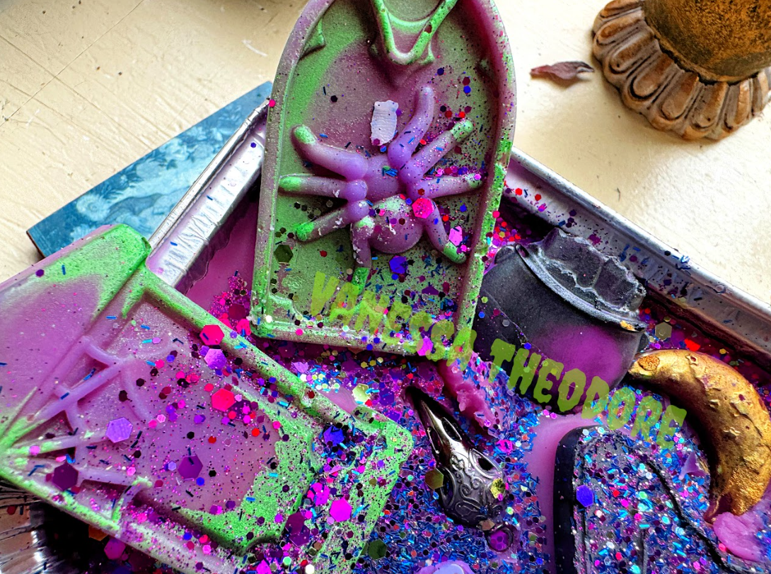 Witching Hour will be featured in a giftset box with a cauldron tealight warmer, but this lil blog piece is talking about the wax melt art loaf that I created.  I really had no design in mind at all, and I kinda just went with it!